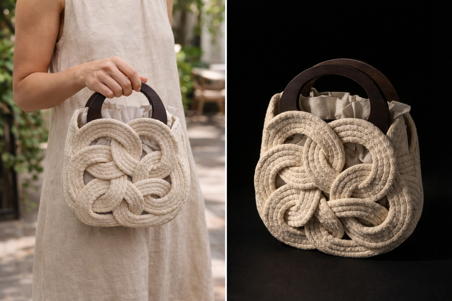 Crafted from handwoven cotton cord in a soft cream tone, this piece is complemented by rich brown wooden handles that add warmth, contrast, and an organic touch. The combination of materials evokes a sense of effortless elegance—perfect for those drawn to pieces that feel curated, not common.