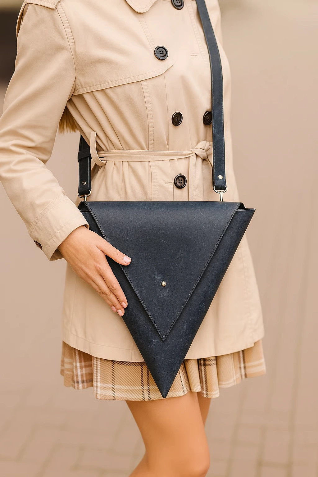 Crafted from genuine leather, this modern triangular crossbody blends clean design with timeless craftsmanship. Compact yet surprisingly spacious, it features a structured silhouette, flap closure with holster screw, and an interior pocket for small essentials. The detachable, adjustable strap allows you to wear it as a crossbody, shoulder bag, or transform it into a clutch for a sleek, minimal look. A standout accessory designed for women who love bold shapes and effortless style. Color; Distressed navy leather