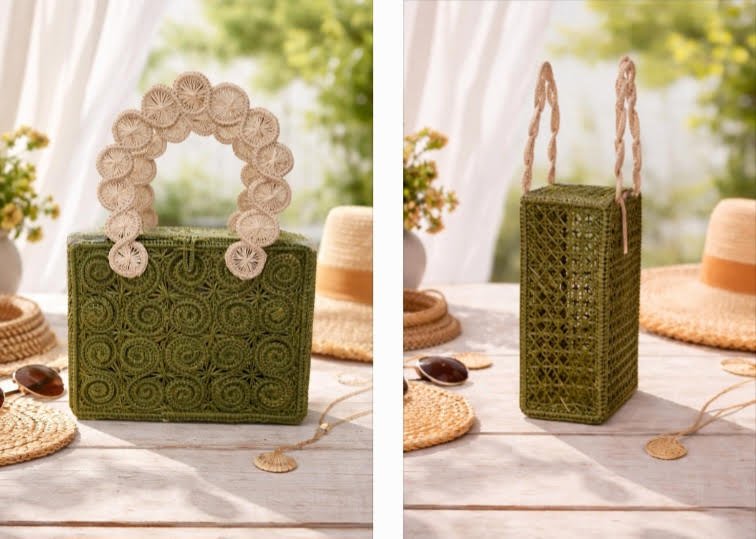 Crafted with intricate woven detailing and a structured silhouette, this handbag blends artisan craftsmanship with modern elegance. The sculptural circular top handle adds a soft, feminine contrast to the clean box shape, making it both timeless and eye-catching.