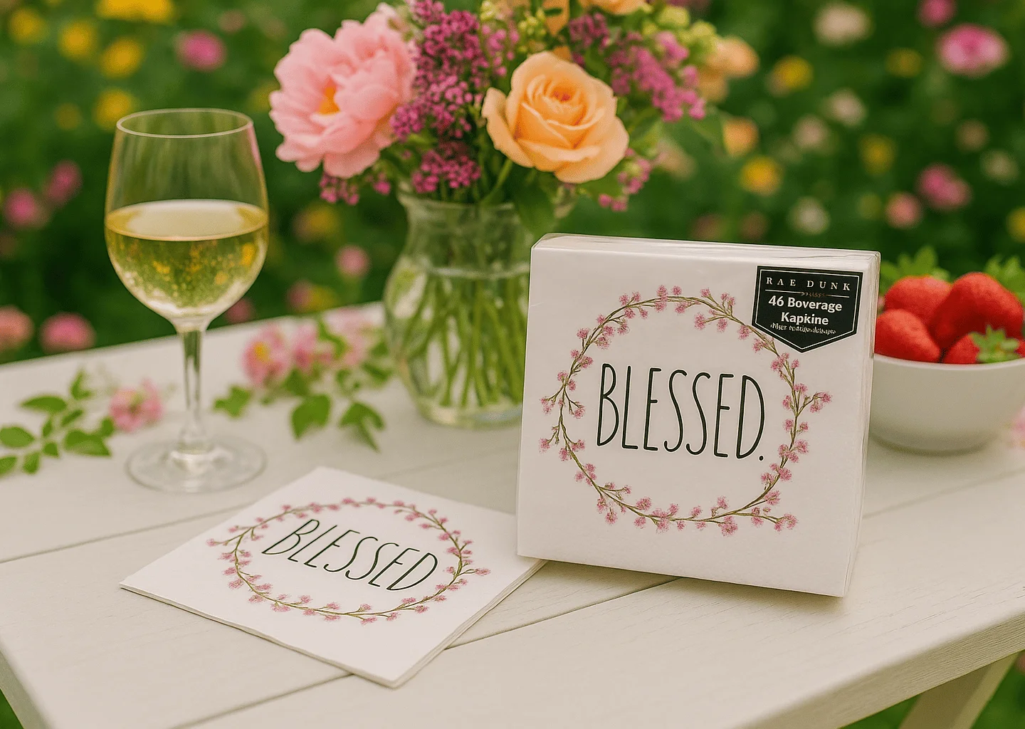 Add a touch of charm to any gathering with these 3-ply Rae Dunn beverage napkins. Featuring the signature “Blessed” script surrounded by a delicate pink floral wreath, each 10×10 inch napkin brings a soft, elegant accent to brunches, parties, and everyday moments. Beautiful, absorbent, and perfect for hosting with grace.