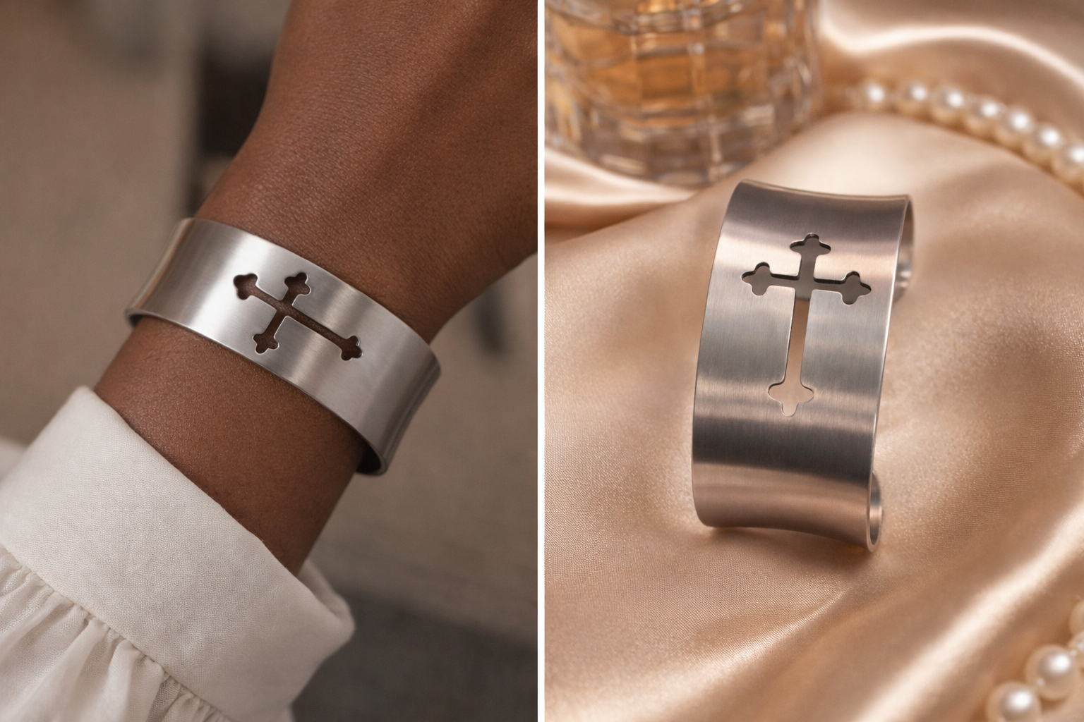 Refined, modern, and deeply symbolic, this cross cuff bracelet is a statement of both style and faith.